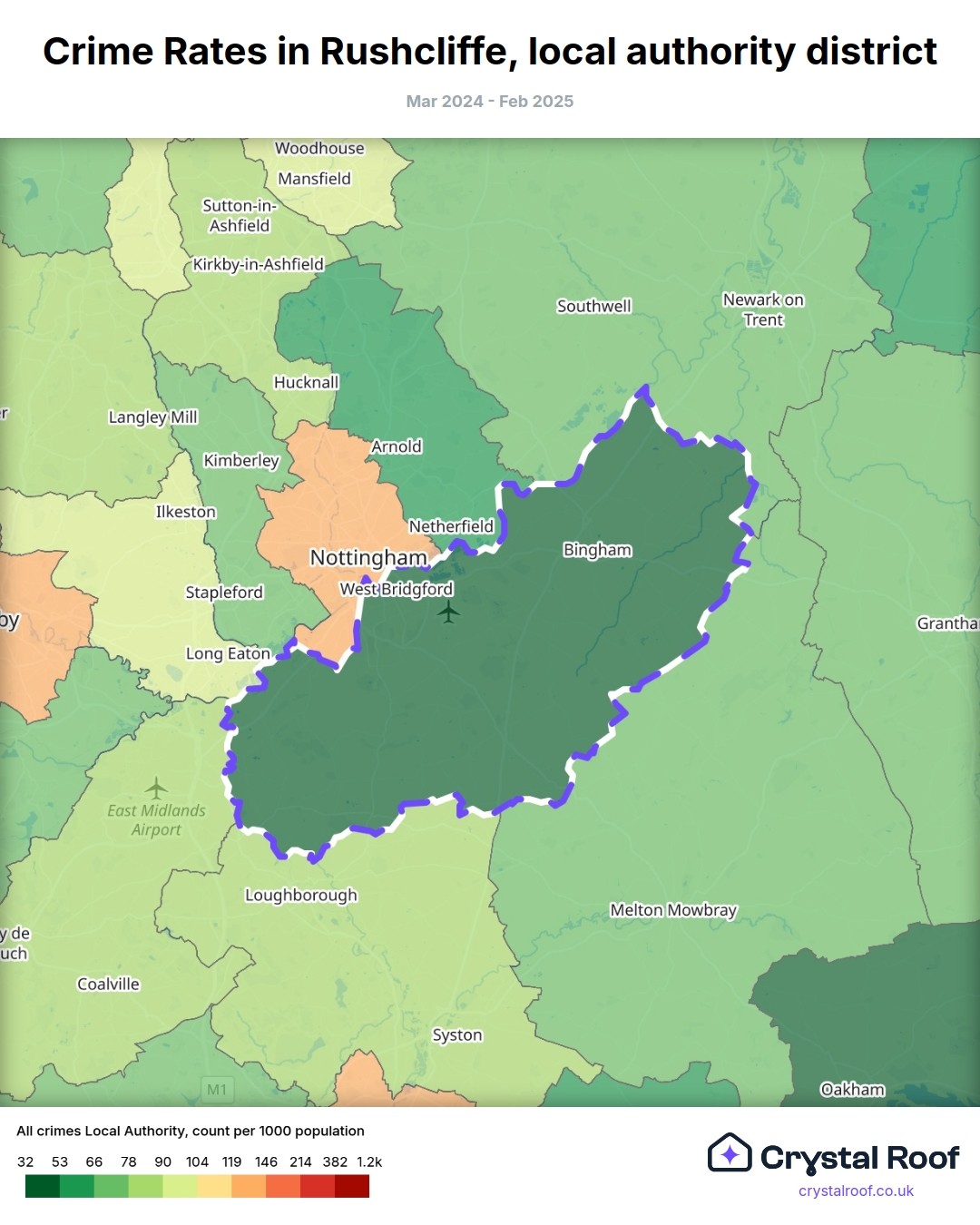 Annual total crime rate in Rushcliffe, (local authority district) is 52.6 crimes per thousand resident population. This can be rated as 1 out of 10 or low crime level compared to other boroughs/local authority districts in England and Wales.
