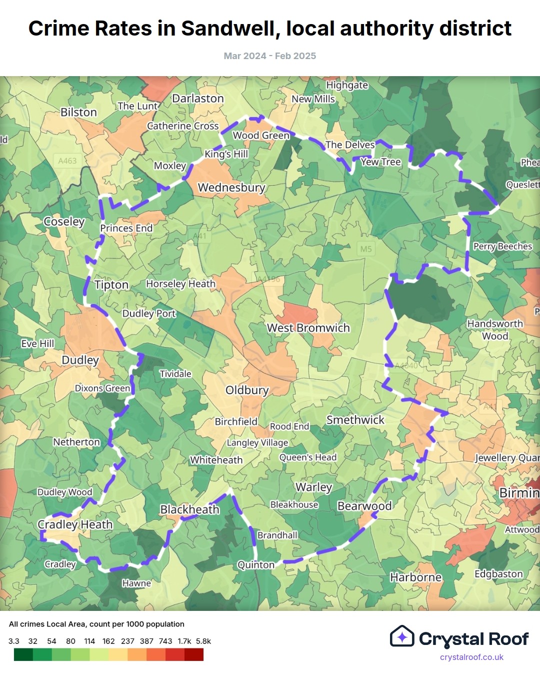 The figures in grey indicate the relative ratings of Sandwell (local authority district) for a specific crime type compared to other boroughs/local authority districts in England and Wales.