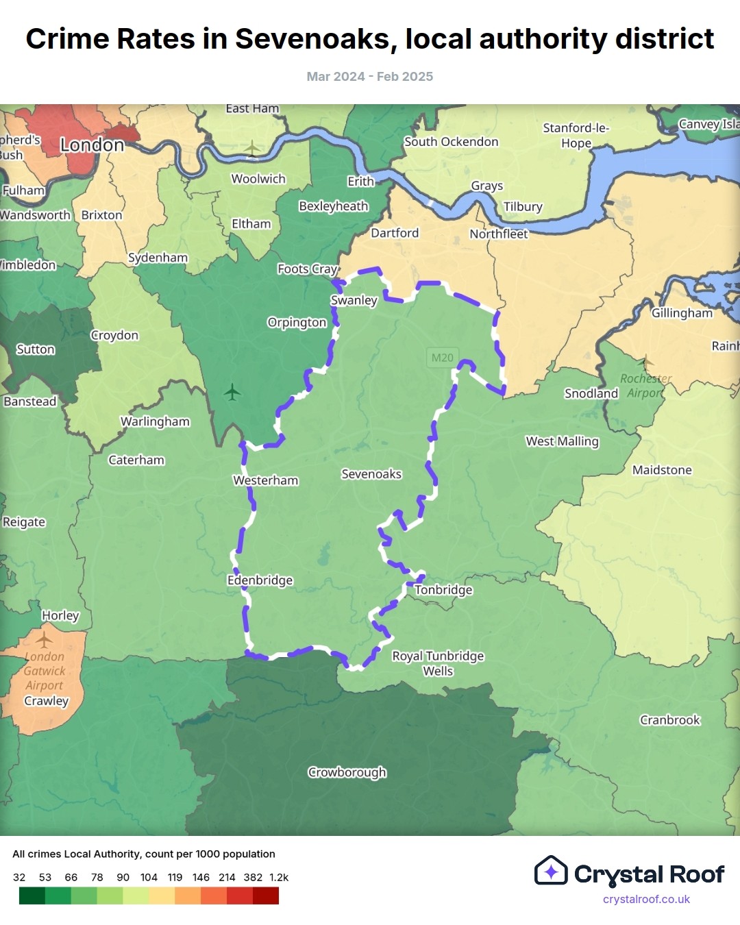 Annual total crime rate in Sevenoaks, (local authority district) is 65 crimes per thousand resident population. This can be rated as 2 out of 10 or low crime level compared to other boroughs/local authority districts in England and Wales.