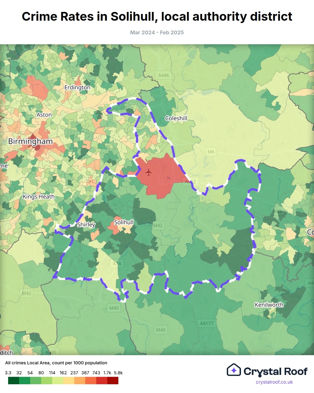 Annual total crime rate in Solihull, (local authority district) is 86.6 crimes per thousand resident population. This can be rated as 4 out of 10 or low crime level compared to other boroughs/local authority districts in England and Wales.