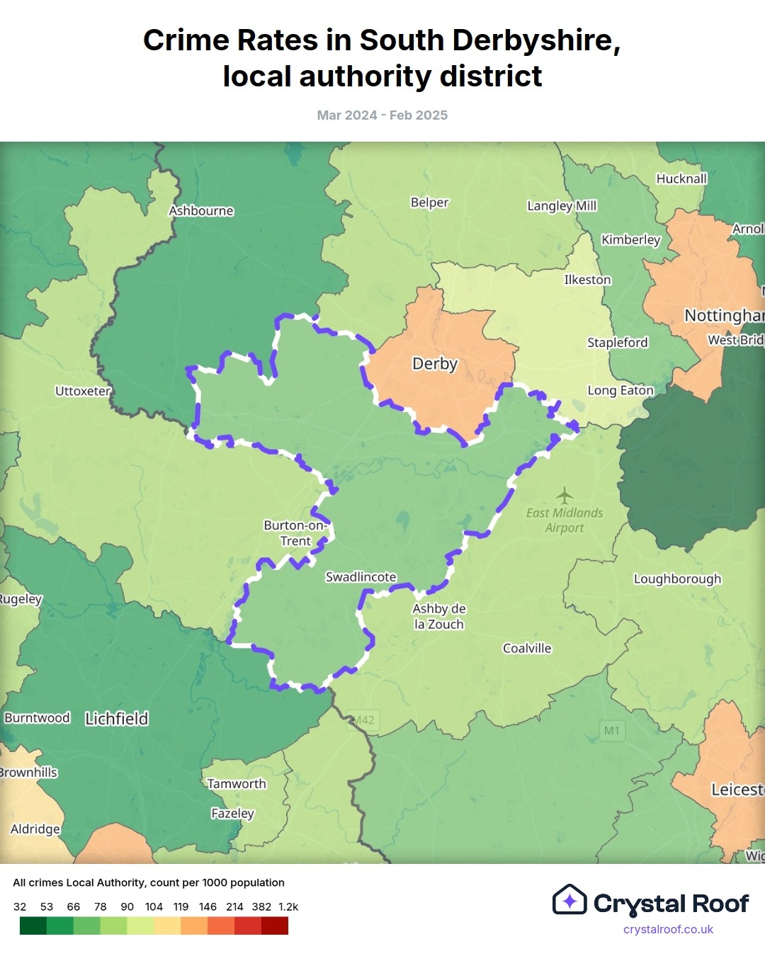 Annual total crime rate in South Derbyshire, (local authority district) is 70.9 crimes per thousand resident population. This can be rated as 2 out of 10 or low crime level compared to other boroughs/local authority districts in England and Wales.