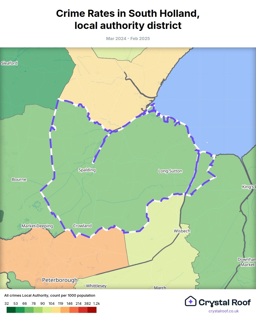The figures in grey indicate the relative ratings of South Holland (local authority district) for a specific crime type compared to other boroughs/local authority districts in England and Wales.
