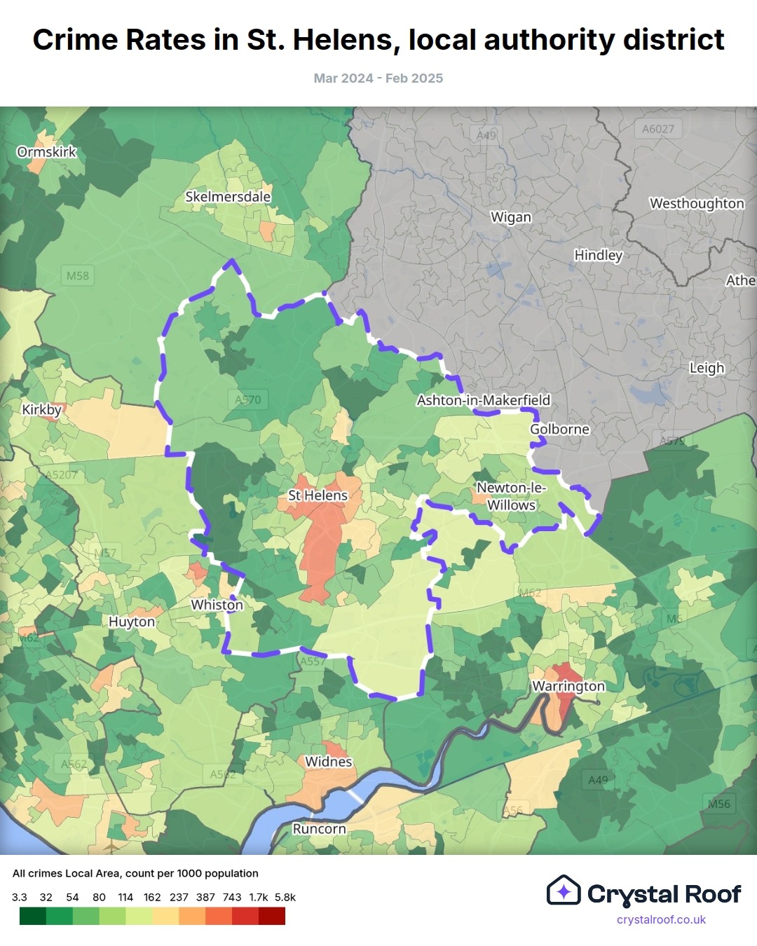 The figures in black represent the number of crimes of a certain type per thousand resident population in St. Helens (local authority district).