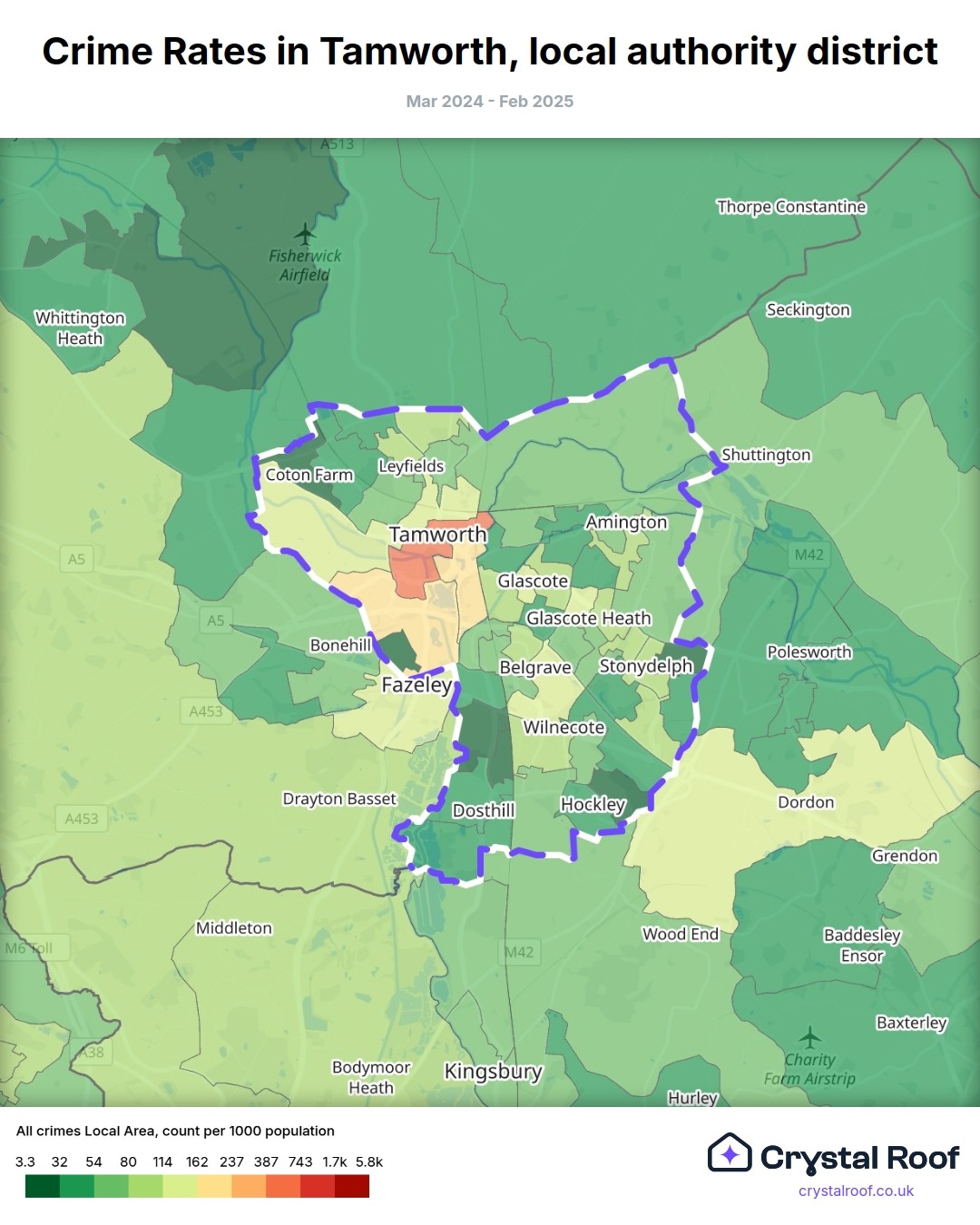 The figures in grey indicate the relative ratings of Tamworth (local authority district) for a specific crime type compared to other boroughs/local authority districts in England and Wales.