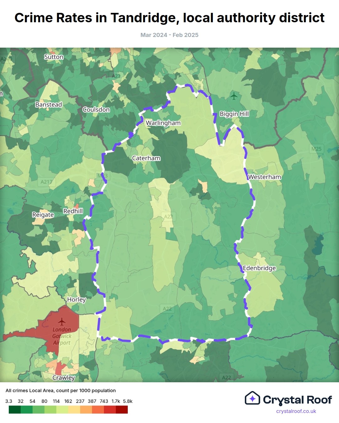 Annual total crime rate in Tandridge, (local authority district) is 70.9 crimes per thousand resident population. This can be rated as 2 out of 10 or low crime level compared to other boroughs/local authority districts in England and Wales.