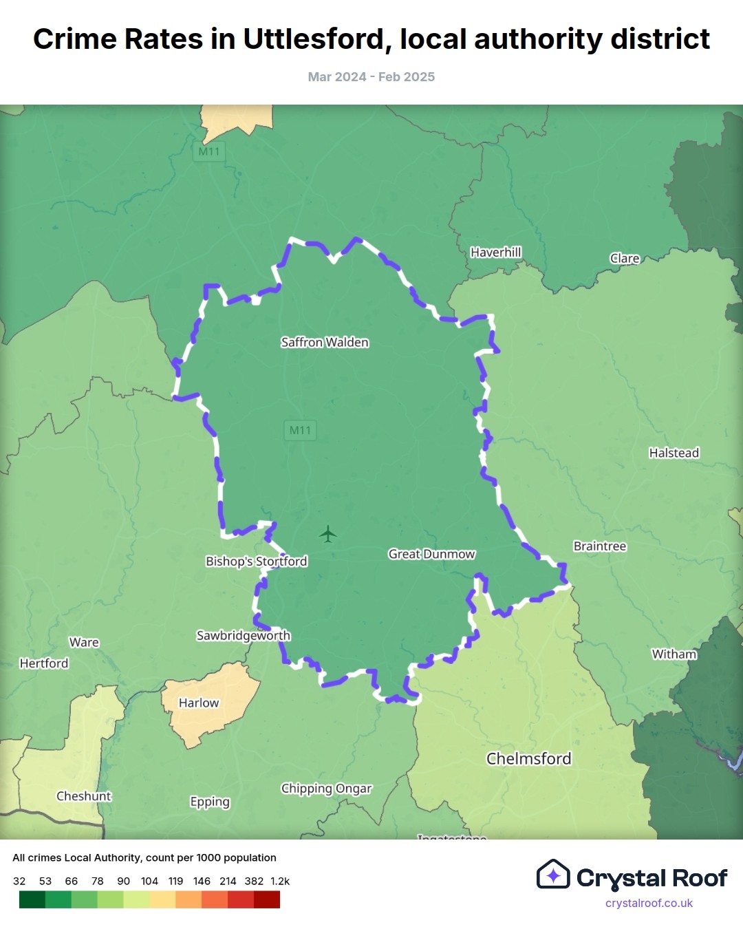 Annual total crime rate in Uttlesford, (local authority district) is 62.5 crimes per thousand resident population. This can be rated as 2 out of 10 or low crime level compared to other boroughs/local authority districts in England and Wales.
