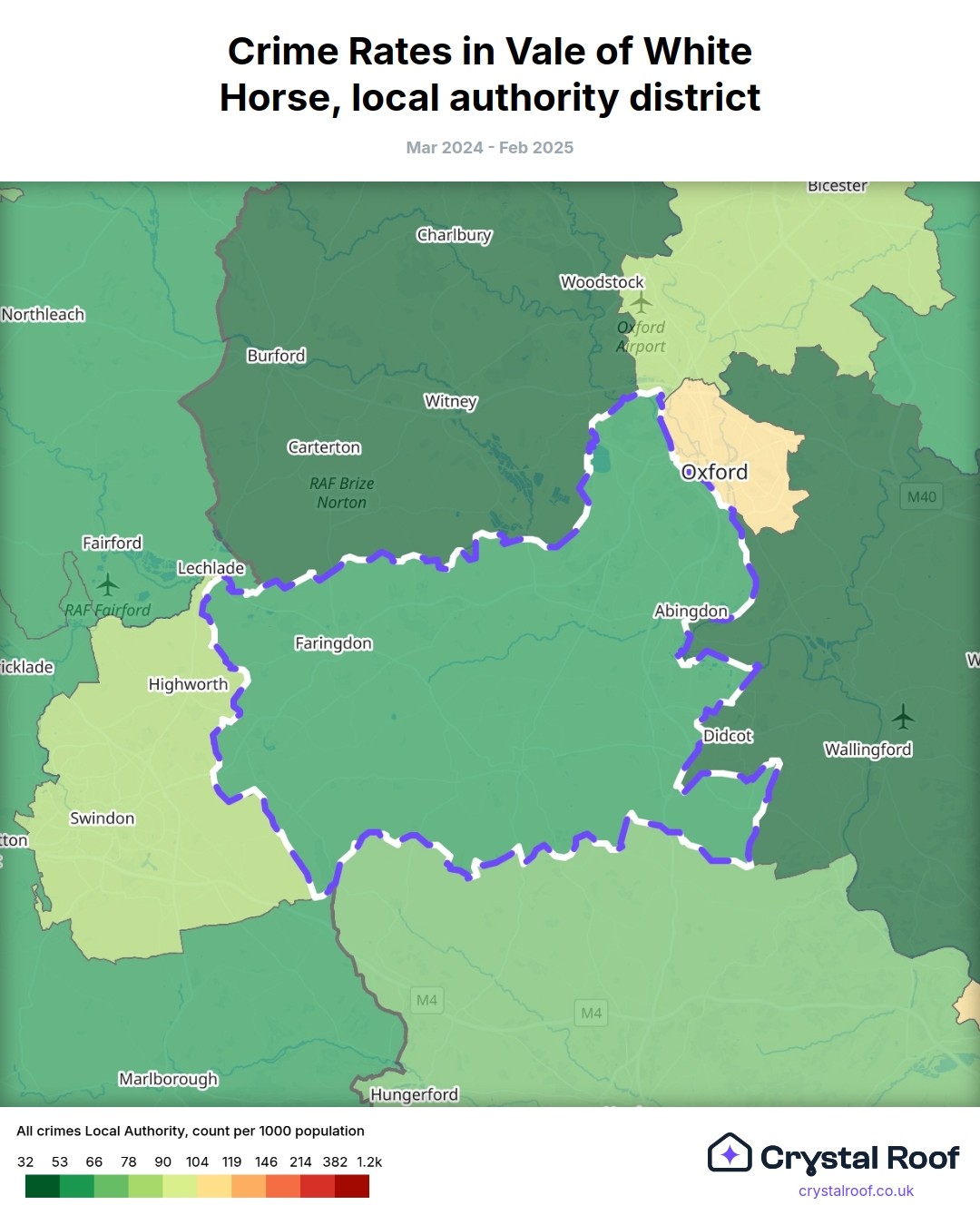 Annual total crime rate in Vale of White Horse, (local authority district) is 58.9 crimes per thousand resident population. This can be rated as 2 out of 10 or low crime level compared to other boroughs/local authority districts in England and Wales.