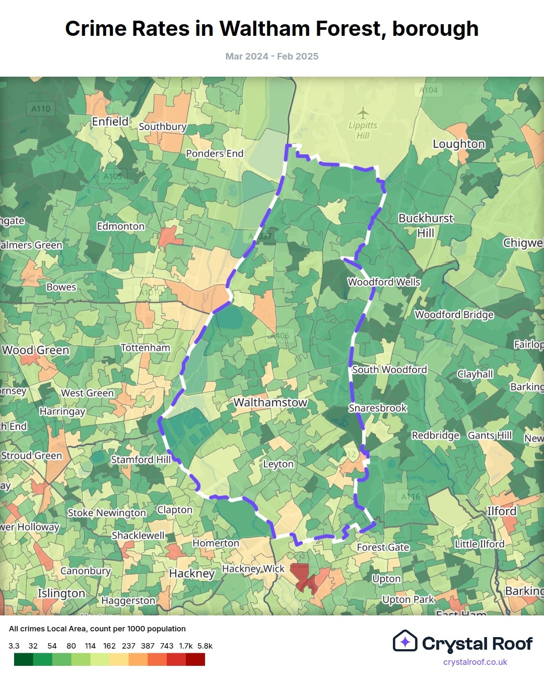 The figures in grey indicate the relative ratings of Waltham Forest (borough) for a specific crime type compared to other boroughs/local authority districts in England and Wales.
