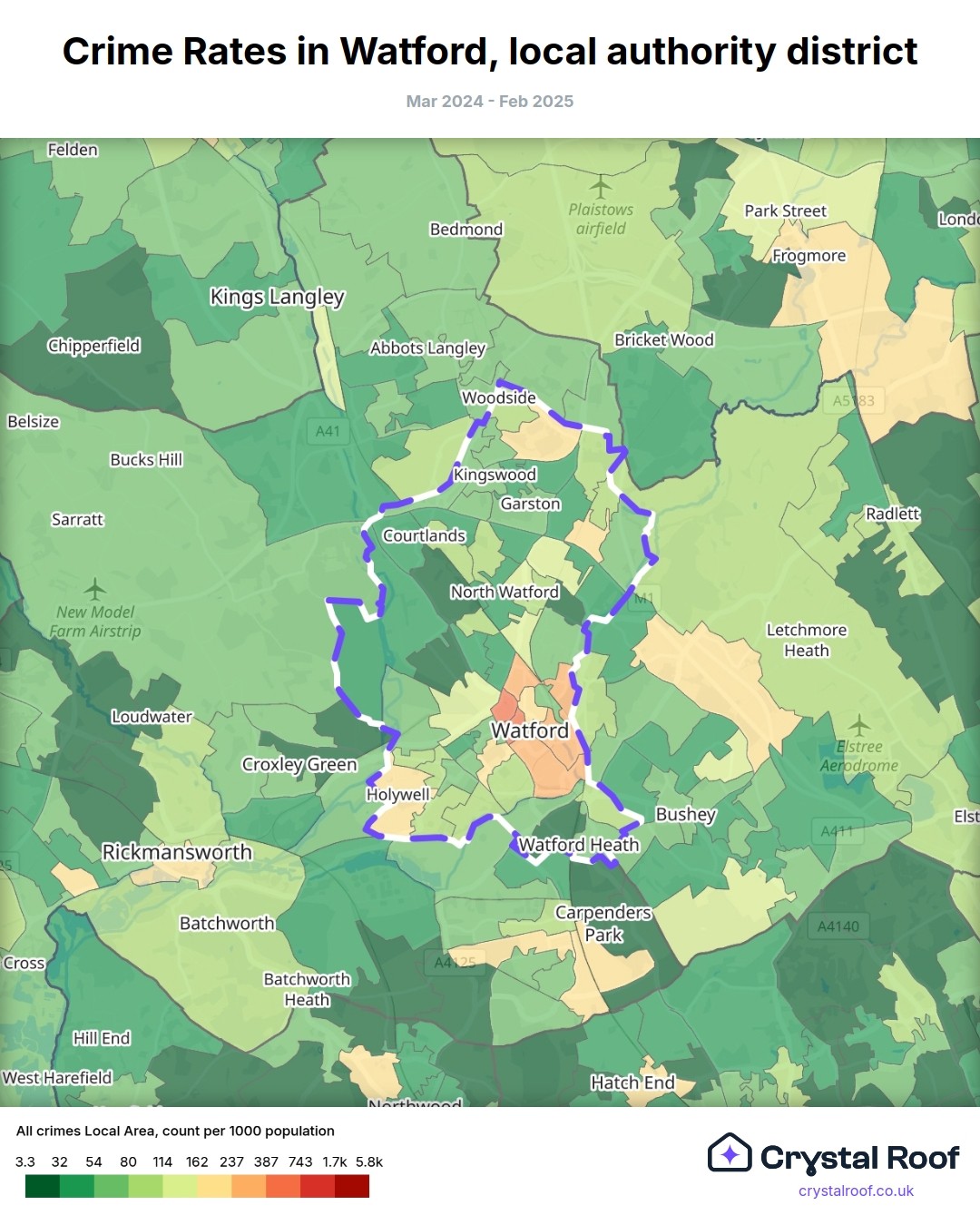 Annual total crime rate in Watford, (local authority district) is 113 crimes per thousand resident population. This can be rated as 5 out of 10 or medium crime level compared to other boroughs/local authority districts in England and Wales.