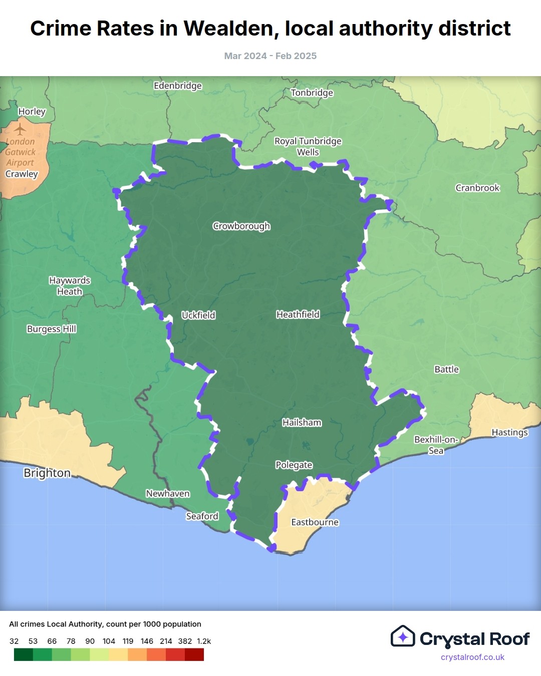 Annual total crime rate in Wealden, (local authority district) is 49.4 crimes per thousand resident population. This can be rated as 1 out of 10 or low crime level compared to other boroughs/local authority districts in England and Wales.