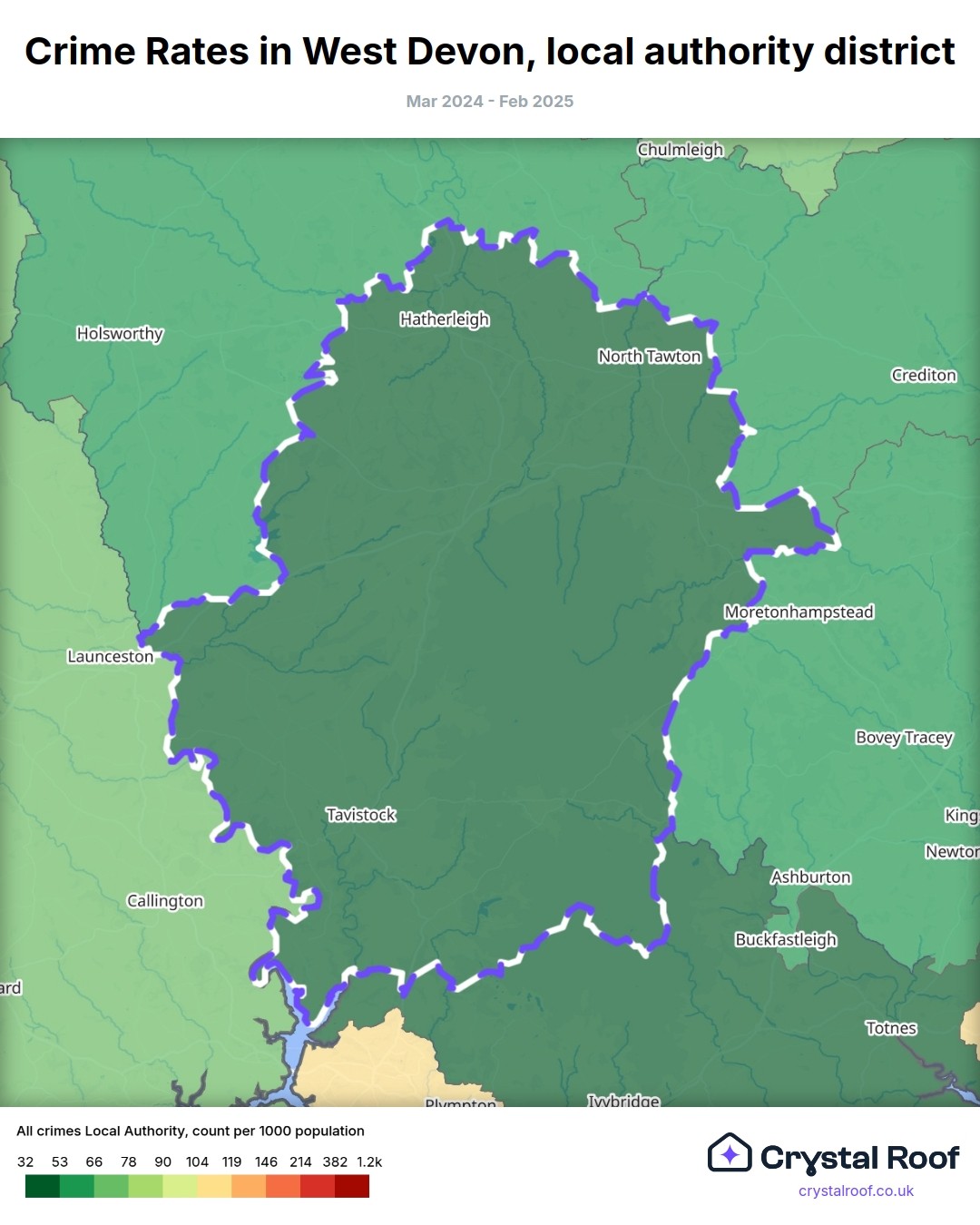 Annual total crime rate in West Devon, (local authority district) is 45.8 crimes per thousand resident population. This can be rated as 1 out of 10 or low crime level compared to other boroughs/local authority districts in England and Wales.
