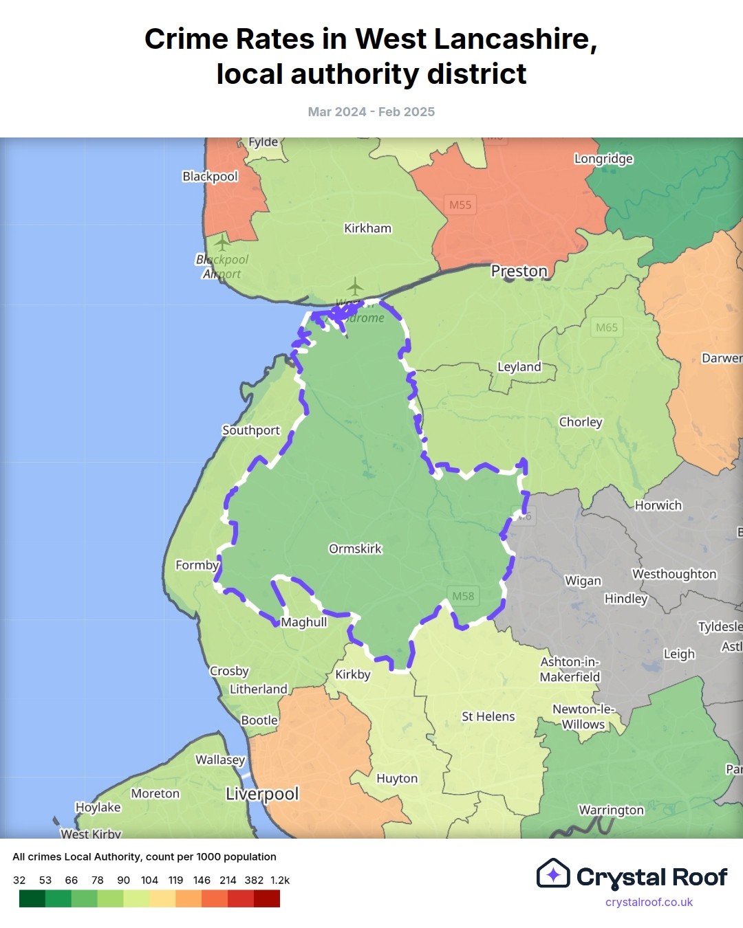 Annual total crime rate in West Lancashire, (local authority district) is 73.4 crimes per thousand resident population. This can be rated as 3 out of 10 or low crime level compared to other boroughs/local authority districts in England and Wales.