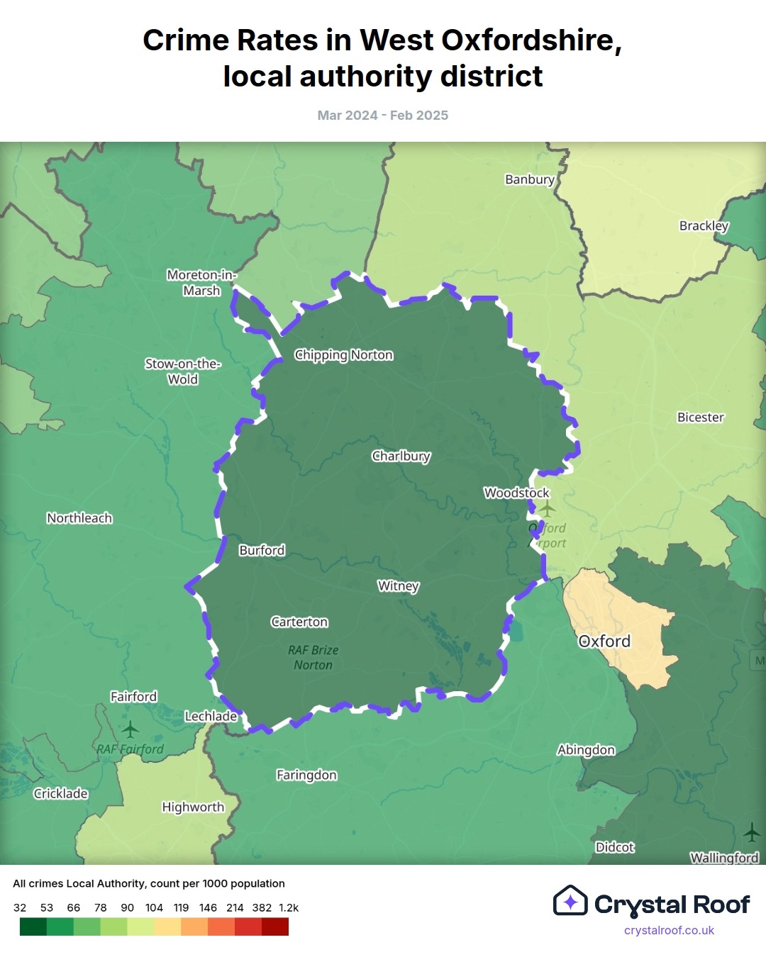 Annual total crime rate in West Oxfordshire, (local authority district) is 53.2 crimes per thousand resident population. This can be rated as 1 out of 10 or low crime level compared to other boroughs/local authority districts in England and Wales.
