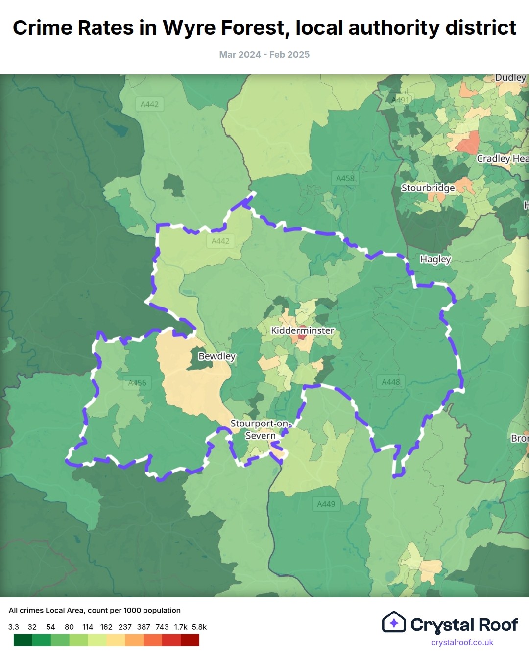 Annual total crime rate in Wyre Forest, (local authority district) is 94.7 crimes per thousand resident population. This can be rated as 4 out of 10 or low crime level compared to other boroughs/local authority districts in England and Wales.