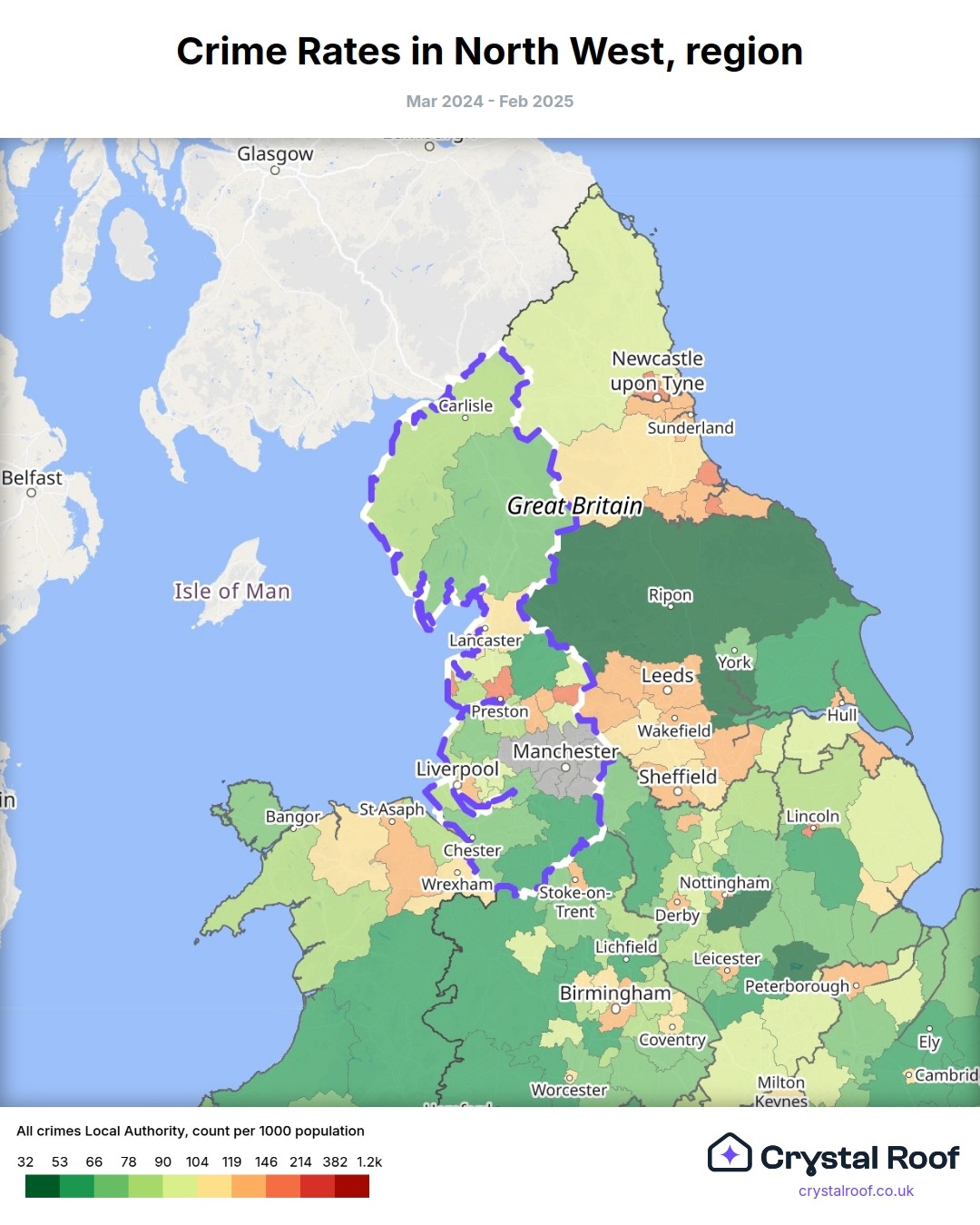 The figures represent the number of annual crimes of a certain type per thousand resident population in North West (region).
