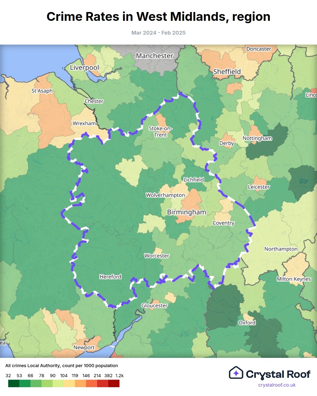 The figures represent the number of annual crimes of a certain type per thousand resident population in West Midlands (region).