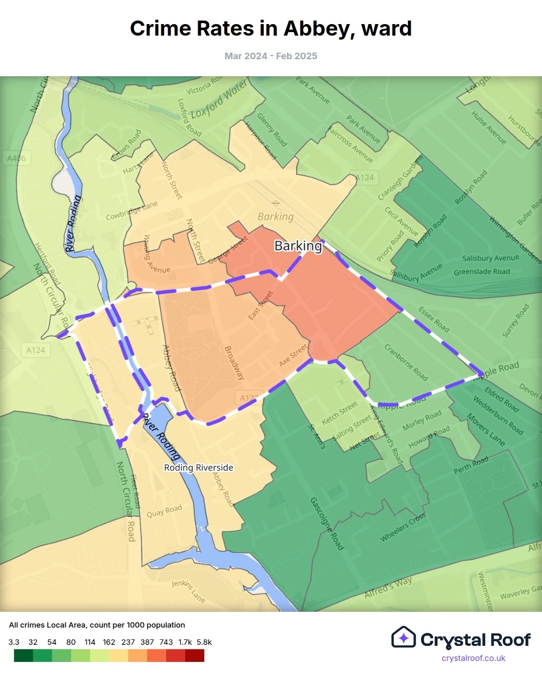 Abbey (ward) is located within Barking and Dagenham (borough). Annual total crime rate in Barking and Dagenham (borough) is 111 crimes per thousand resident population, which can be rated as 5 out of 10 or medium crime level compared to other local authority districts in England and Wales.