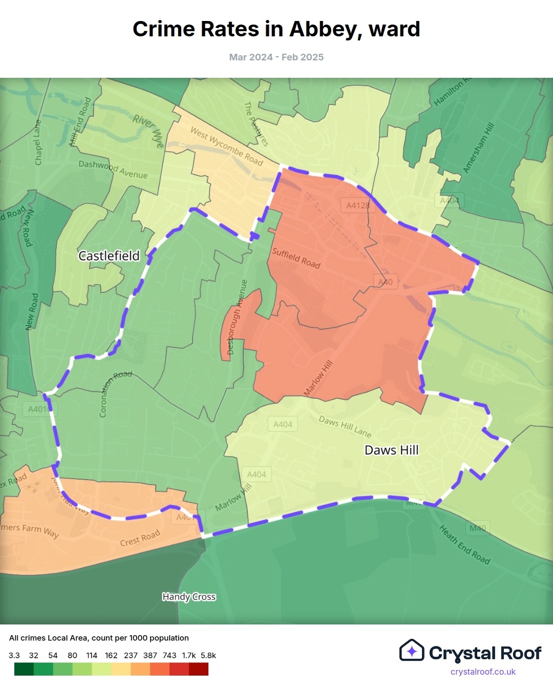 Abbey, (ward) includes areas with the following crime ratings (see map):