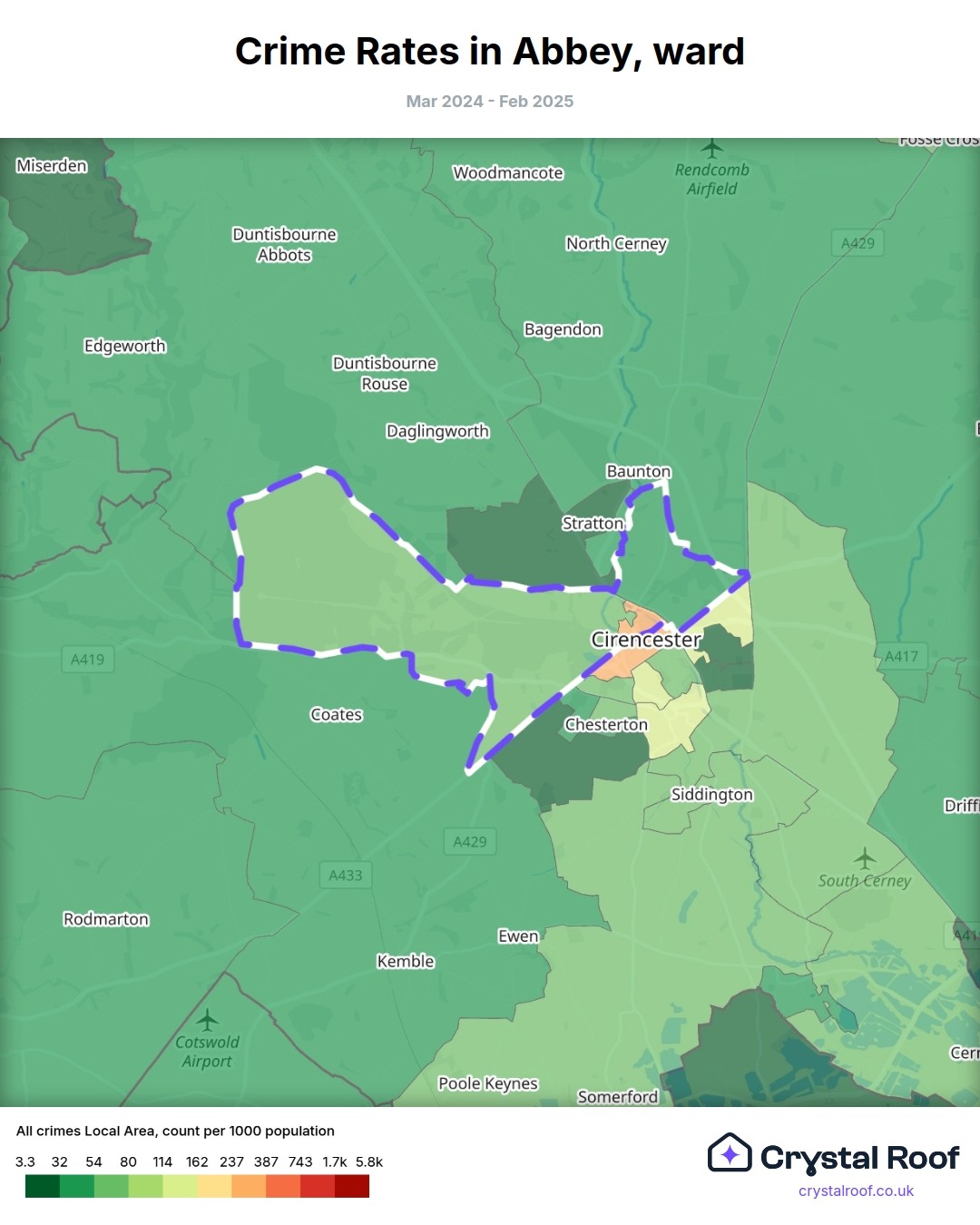 Abbey (ward) is located within Cotswold (borough). Annual total crime rate in Cotswold (borough) is 58.6 crimes per thousand resident population, which can be rated as 2 out of 10 or low crime level compared to other local authority districts in England and Wales.
