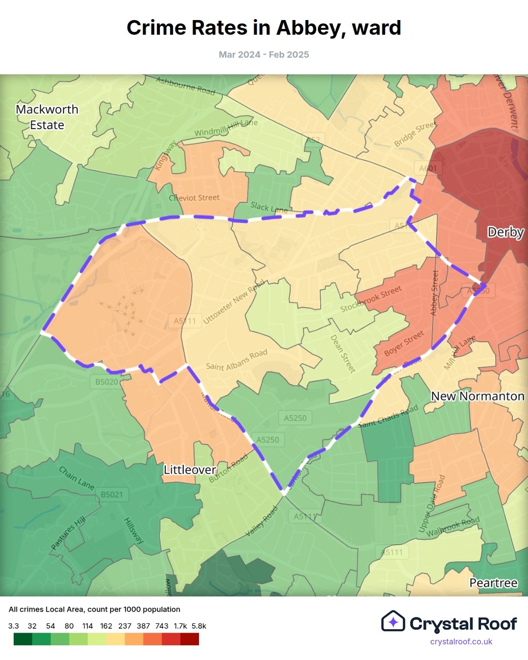 Abbey (ward) is located within Derby (borough). Annual total crime rate in Derby (borough) is 136 crimes per thousand resident population, which can be rated as 7 out of 10 or high crime level compared to other local authority districts in England and Wales.