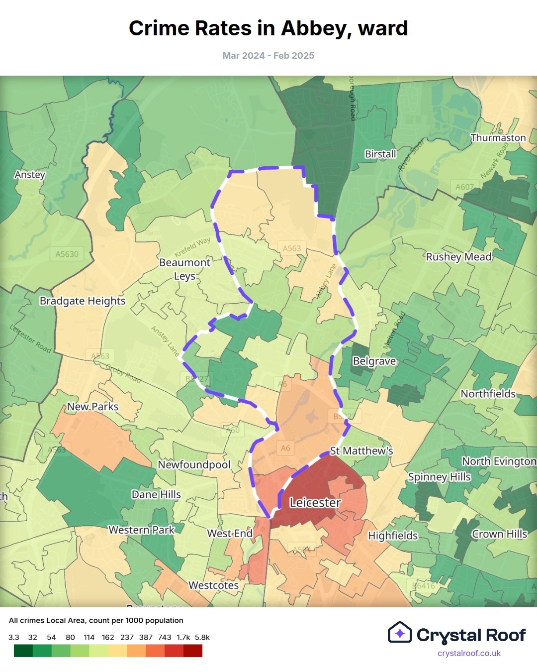 Abbey (ward) is located within Leicester (borough). Annual total crime rate in Leicester (borough) is 137 crimes per thousand resident population, which can be rated as 7 out of 10 or high crime level compared to other local authority districts in England and Wales.