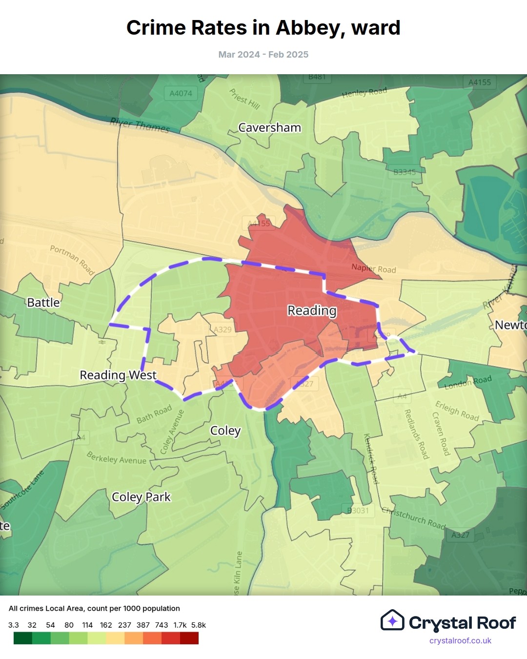 Abbey (ward) is located within Reading (borough). Annual total crime rate in Reading (borough) is 112 crimes per thousand resident population, which can be rated as 5 out of 10 or medium crime level compared to other local authority districts in England and Wales.