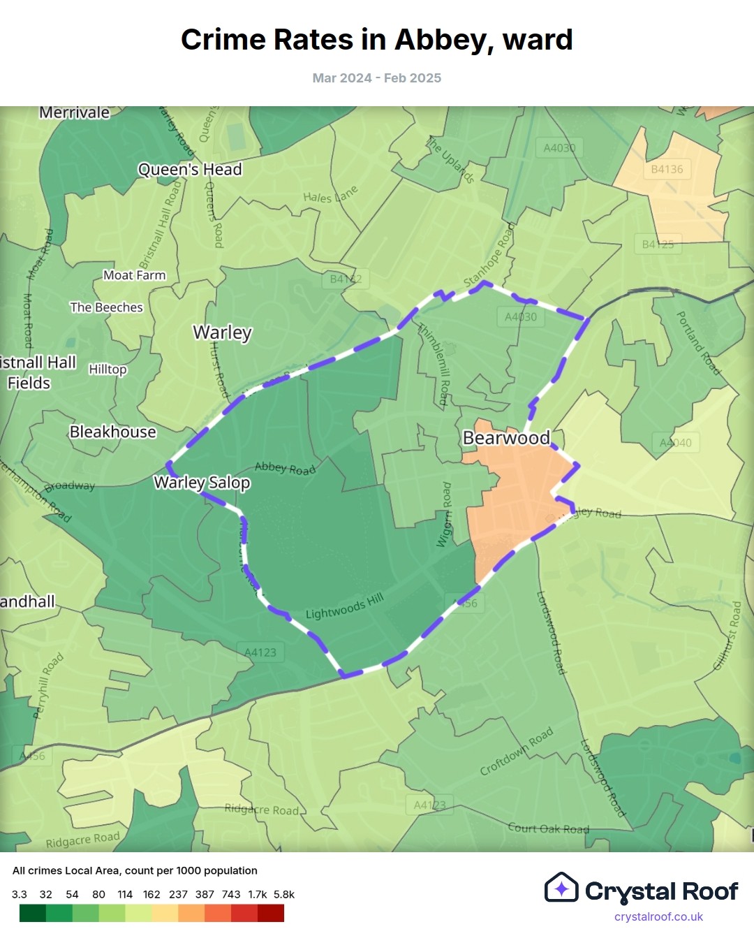 Abbey (ward) is located within Sandwell (borough). Annual total crime rate in Sandwell (borough) is 107 crimes per thousand resident population, which can be rated as 5 out of 10 or medium crime level compared to other local authority districts in England and Wales.