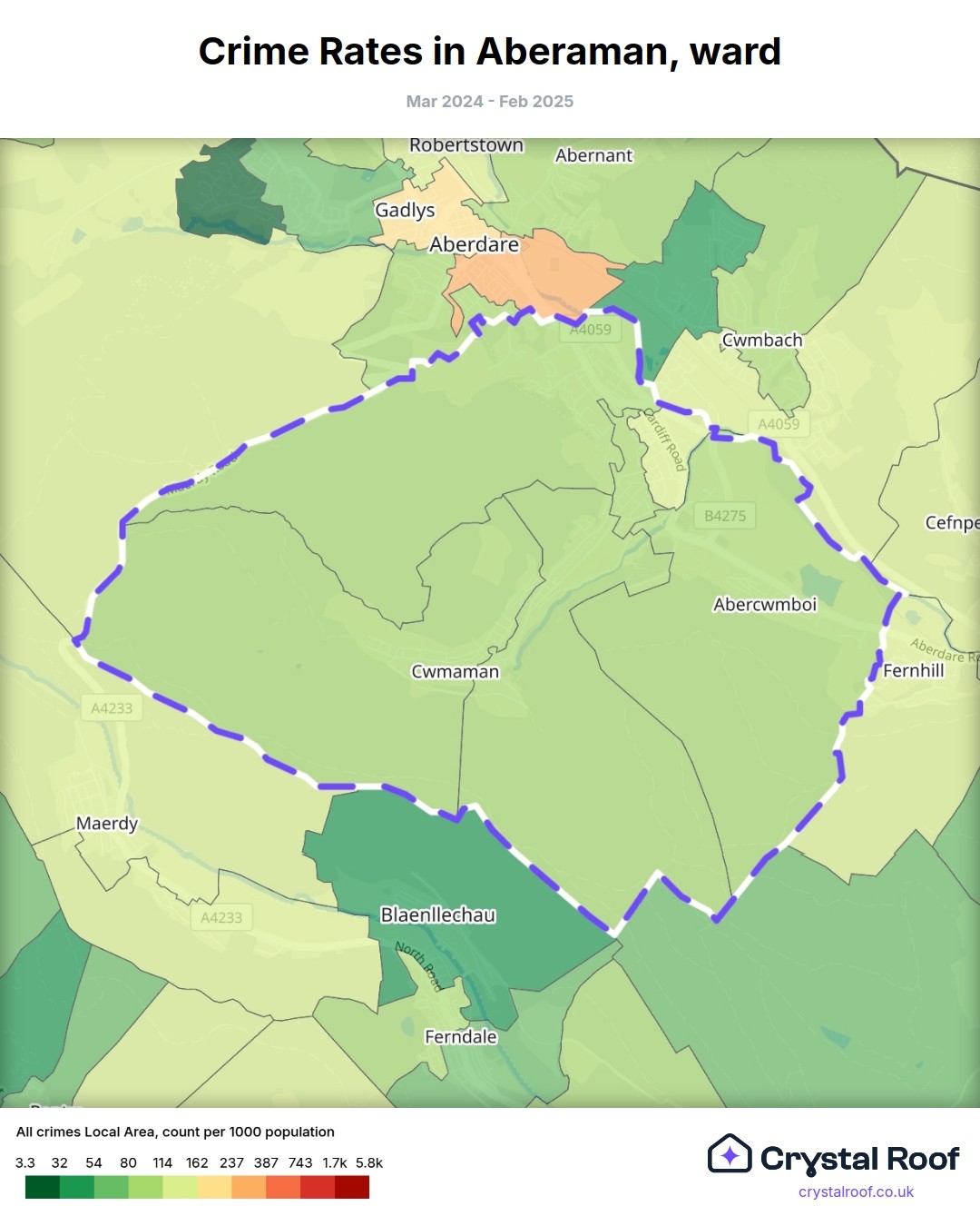 The figures in grey indicate the relative ratings of Aberaman (ward) for a specific crime type compared to other wards in England and Wales.