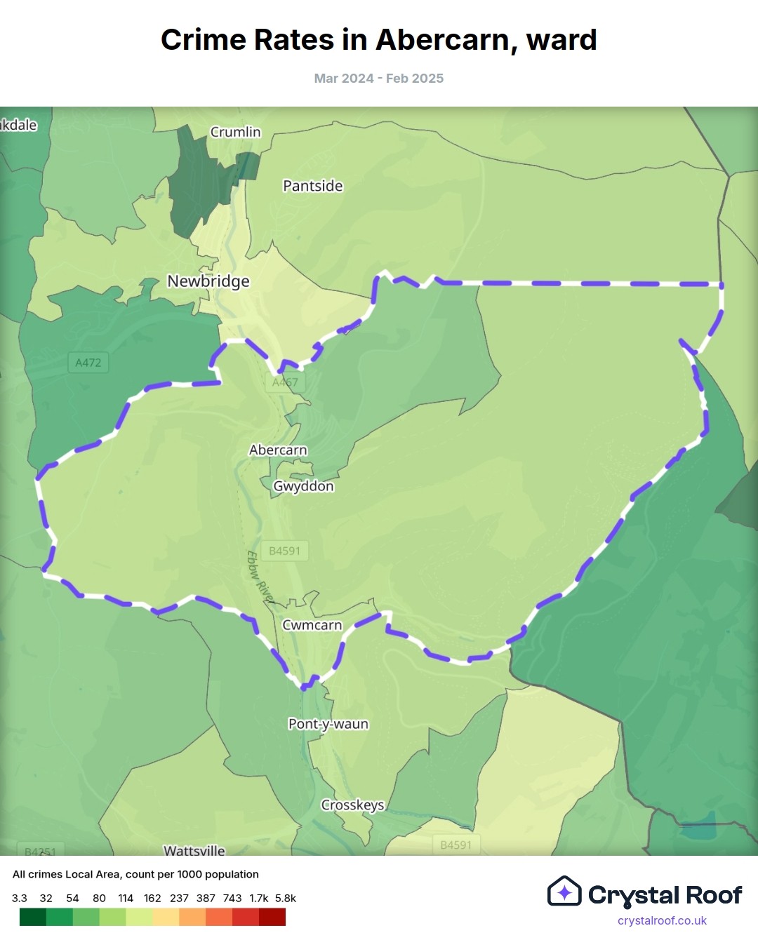 Abercarn, (ward) includes areas with the following crime ratings (see map):