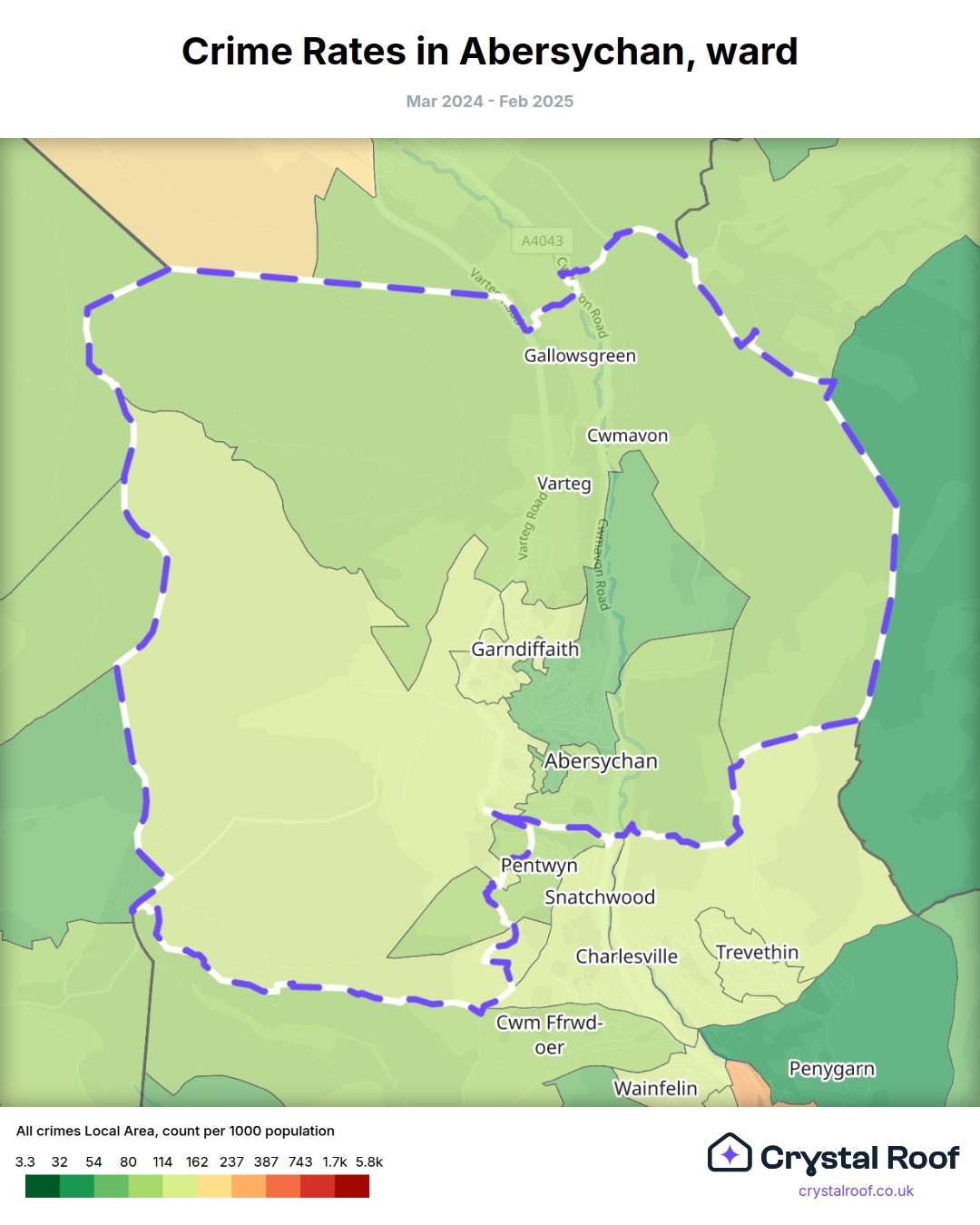 The figures in grey indicate the relative ratings of Abersychan (ward) for a specific crime type compared to other wards in England and Wales.