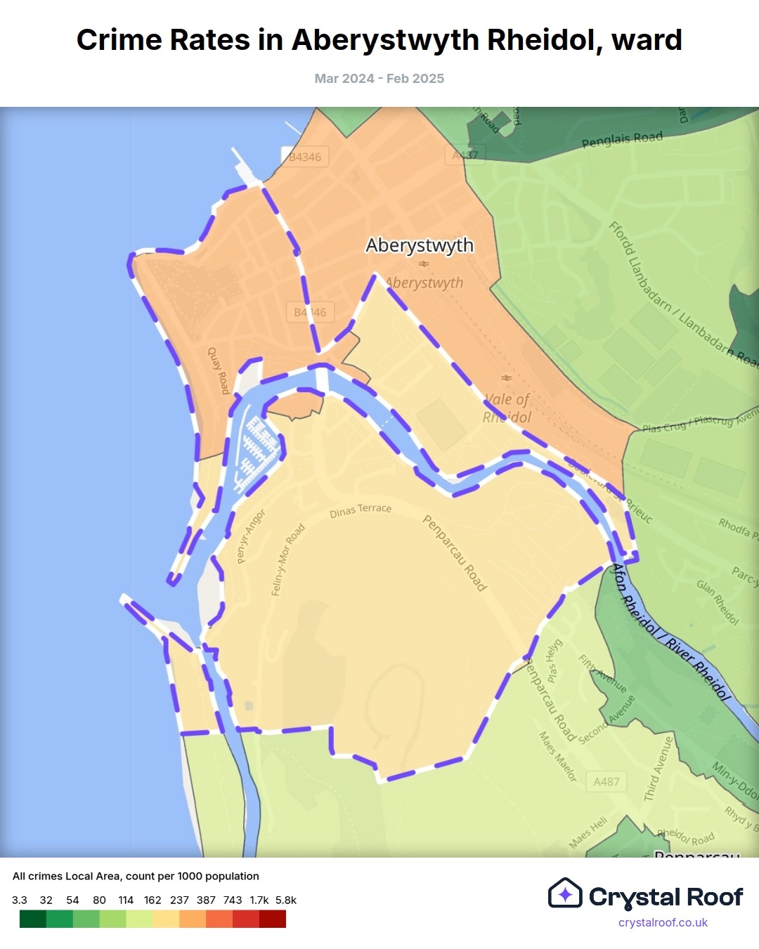 Aberystwyth Rheidol, (ward) includes areas with the following crime ratings (see map):