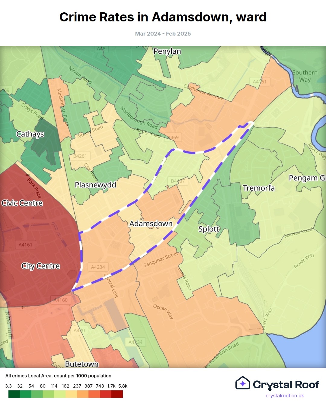 The figures in grey indicate the relative ratings of Adamsdown (ward) for a specific crime type compared to other wards in England and Wales.