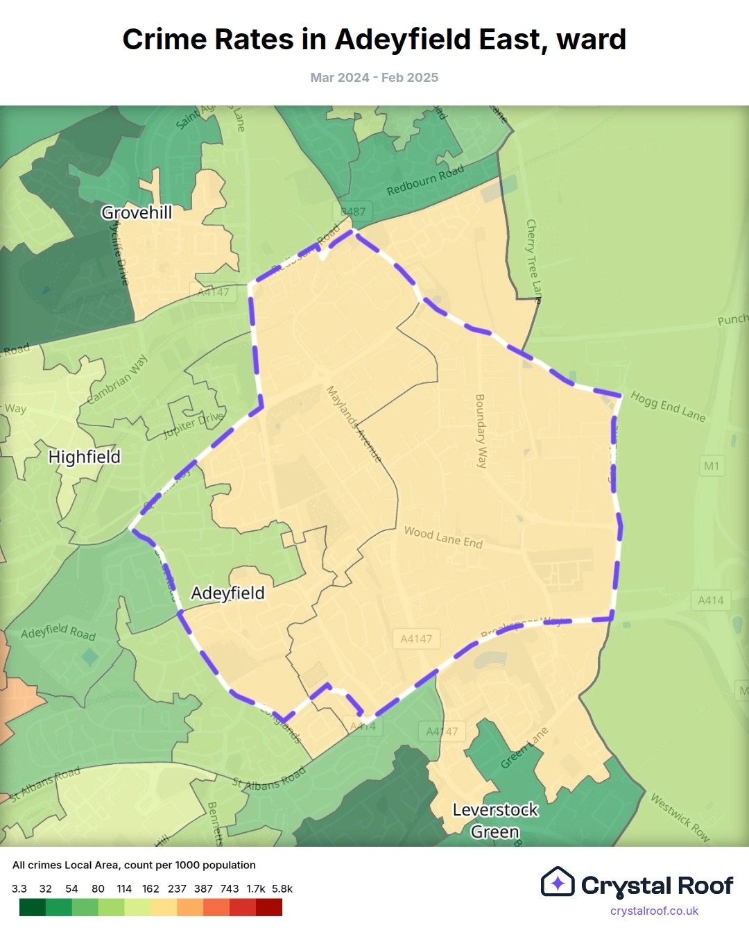 Adeyfield East, (ward) includes areas with the following crime ratings (see map):