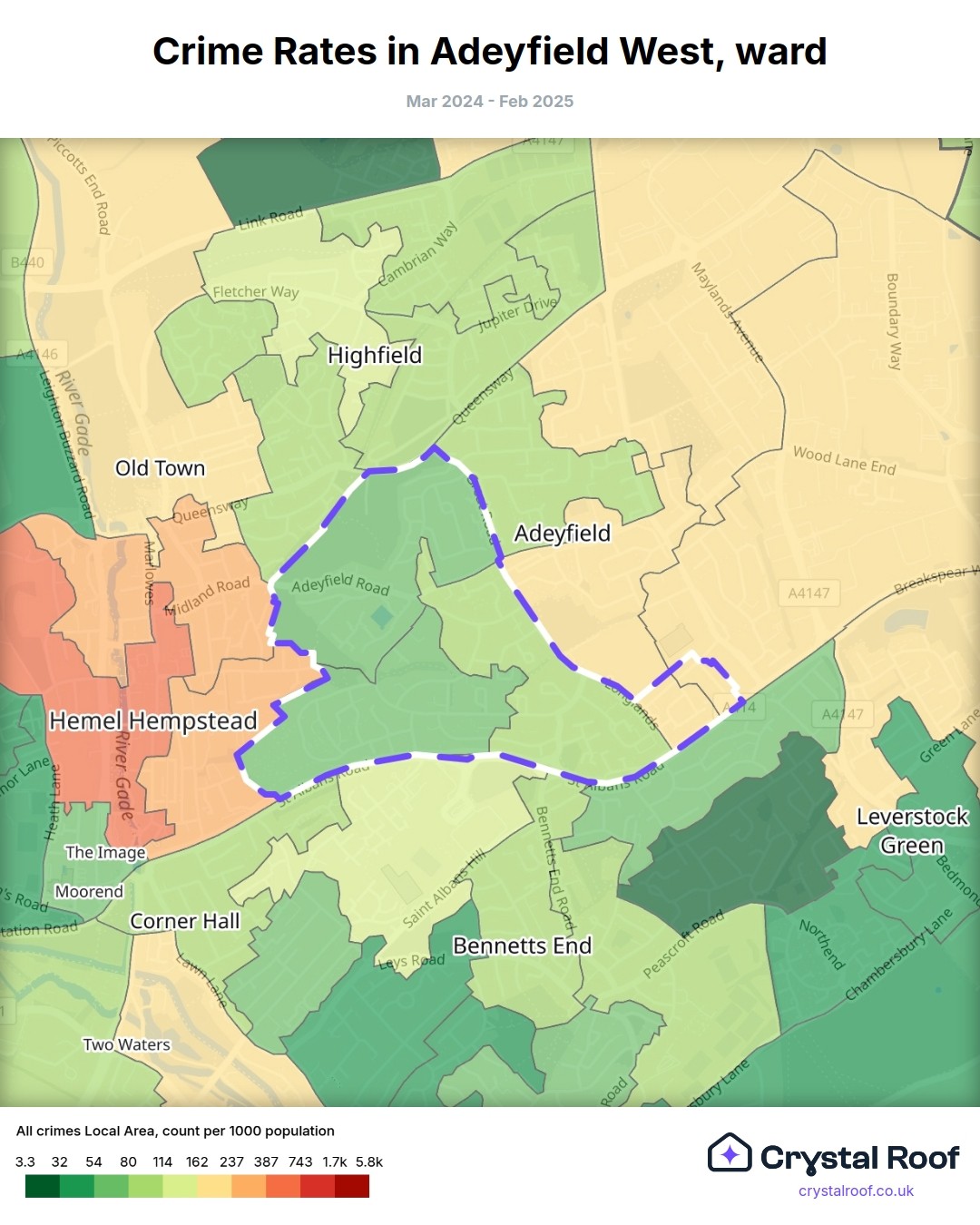 Adeyfield West, (ward) includes areas with the following crime ratings (see map):