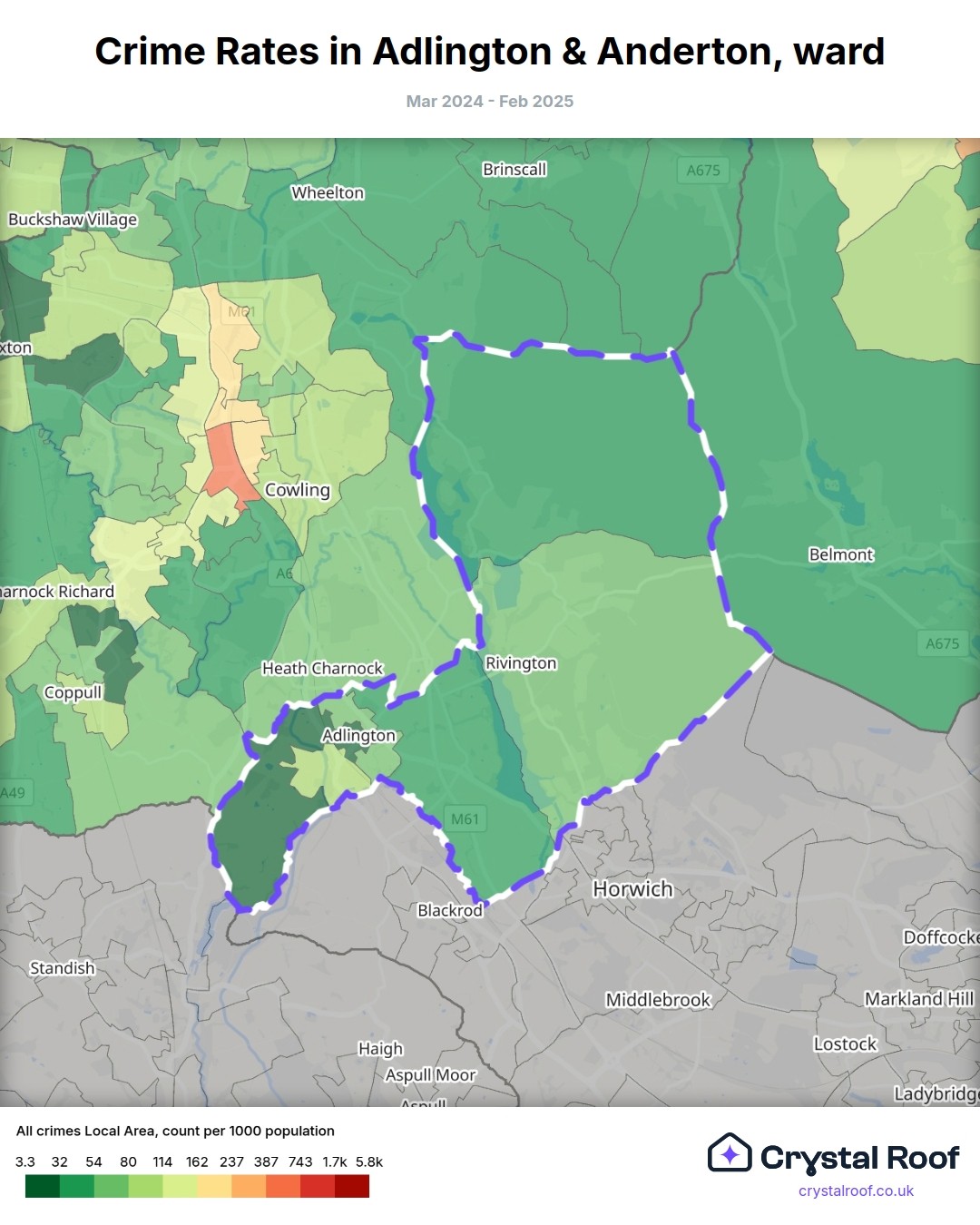 Adlington & Anderton, (ward) includes areas with the following crime ratings (see map):