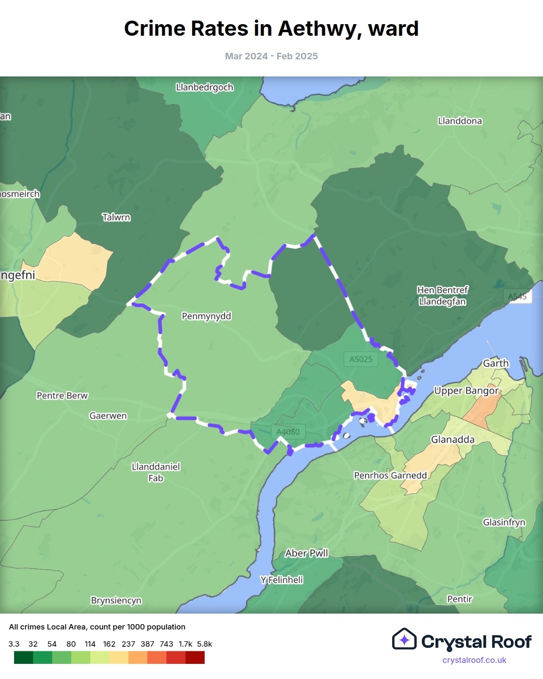 Aethwy, (ward) includes areas with the following crime ratings (see map):