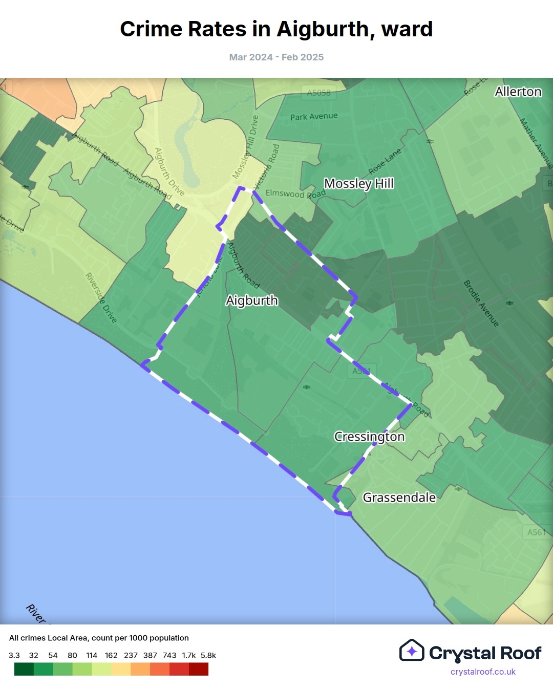 Aigburth, (ward) includes areas with the following crime ratings (see map):