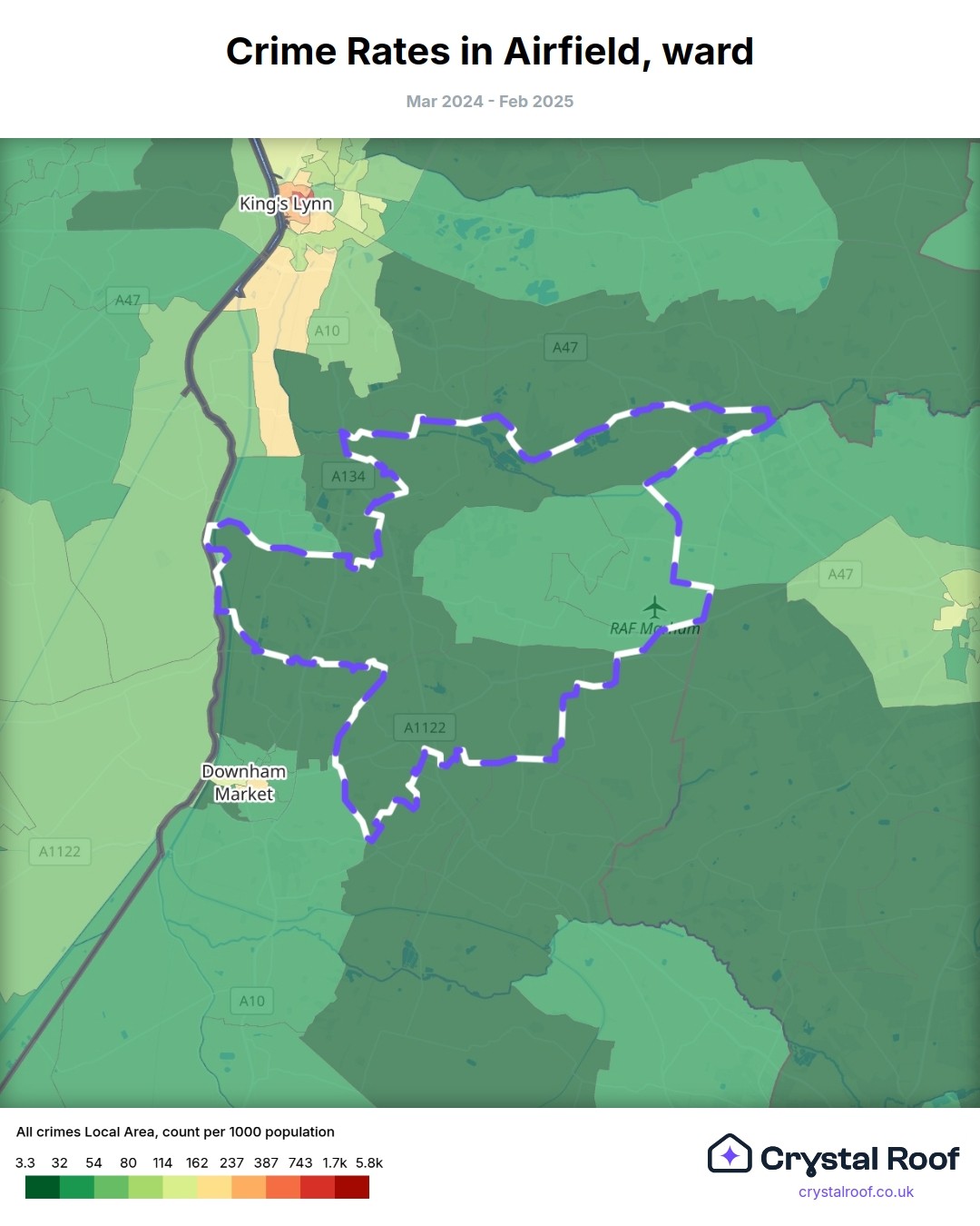 Airfield (ward) is located within King's Lynn and West Norfolk (borough). Annual total crime rate in King's Lynn and West Norfolk (borough) is 68 crimes per thousand resident population, which can be rated as 2 out of 10 or low crime level compared to other local authority districts in England and Wales.