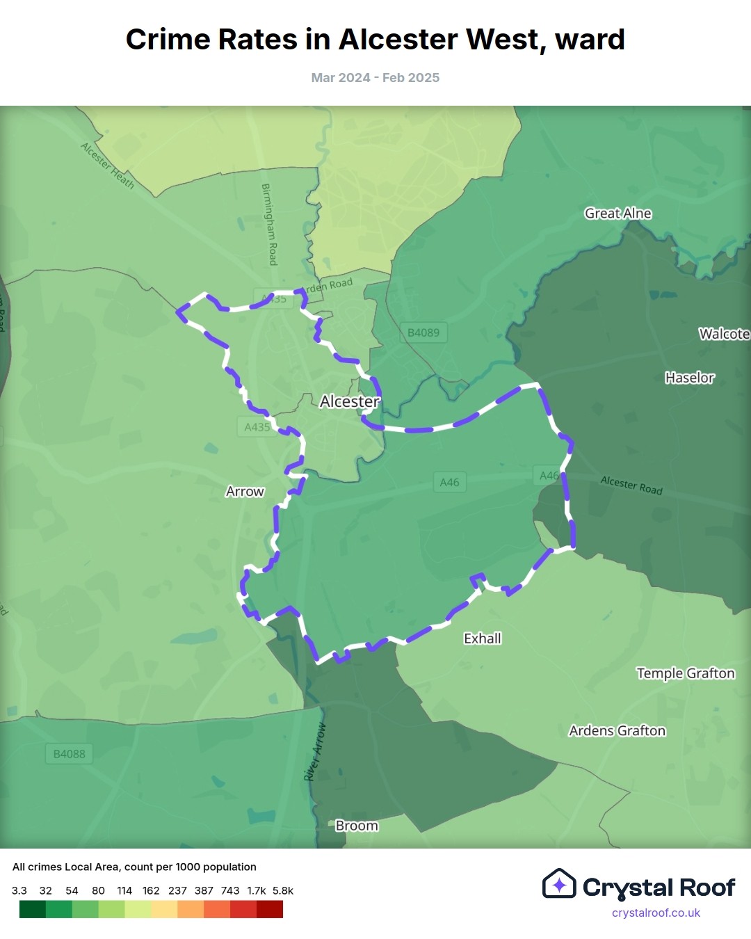 Alcester West, (ward) includes areas with the following crime ratings (see map):