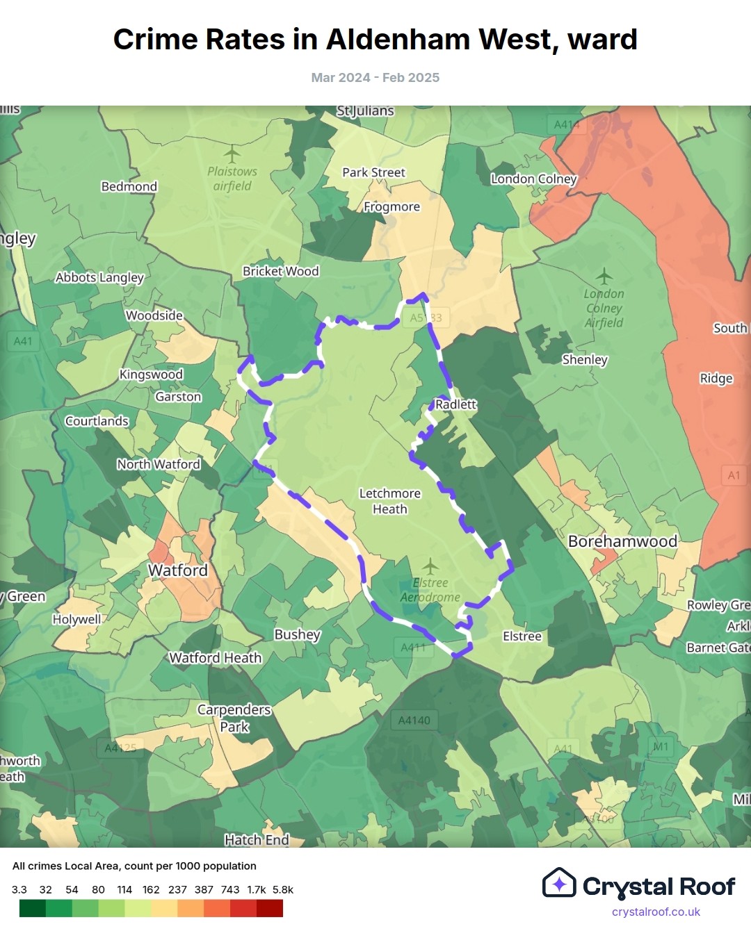 Aldenham West, (ward) includes areas with the following crime ratings (see map):
