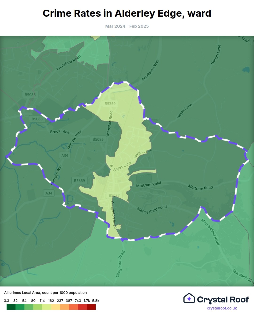 Alderley Edge, (ward) includes areas with the following crime ratings (see map):