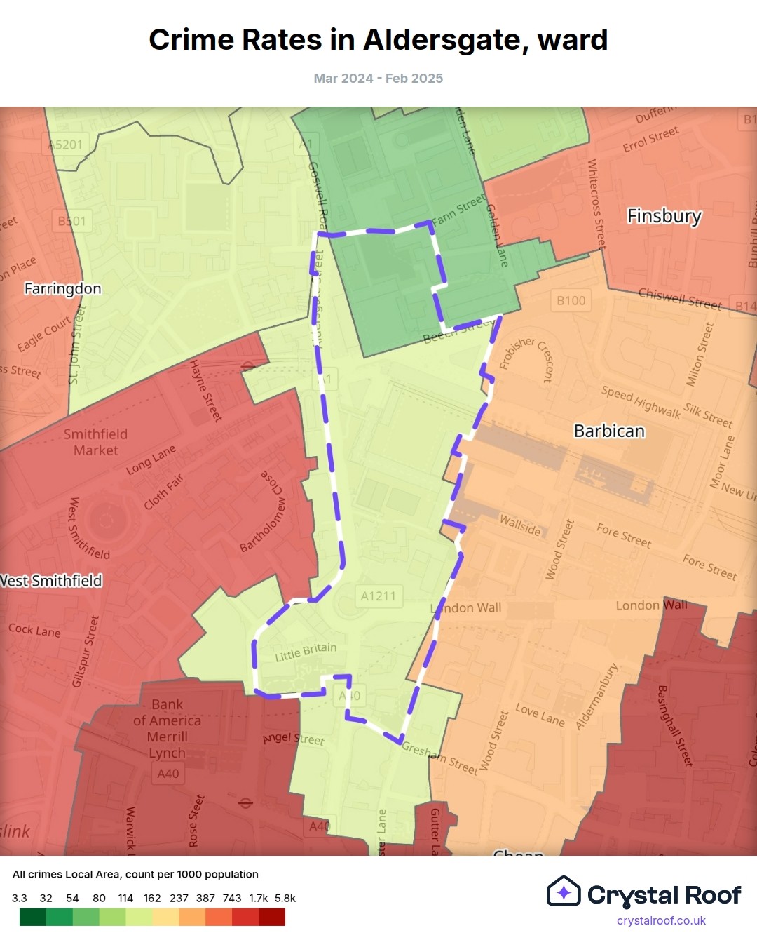 Aldersgate, (ward) includes areas with the following crime ratings (see map):