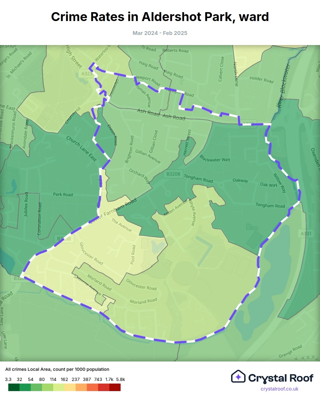 Aldershot Park, (ward) includes areas with the following crime ratings (see map):