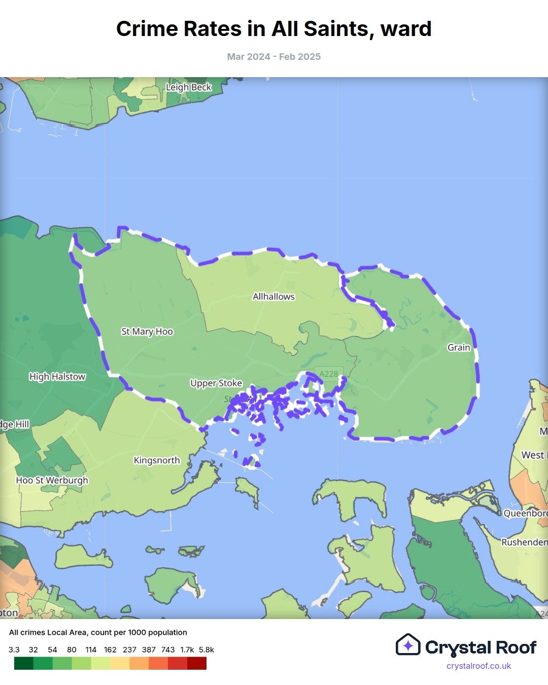 All Saints (ward) is located within Medway (borough). Annual total crime rate in Medway (borough) is 110 crimes per thousand resident population, which can be rated as 5 out of 10 or medium crime level compared to other local authority districts in England and Wales.