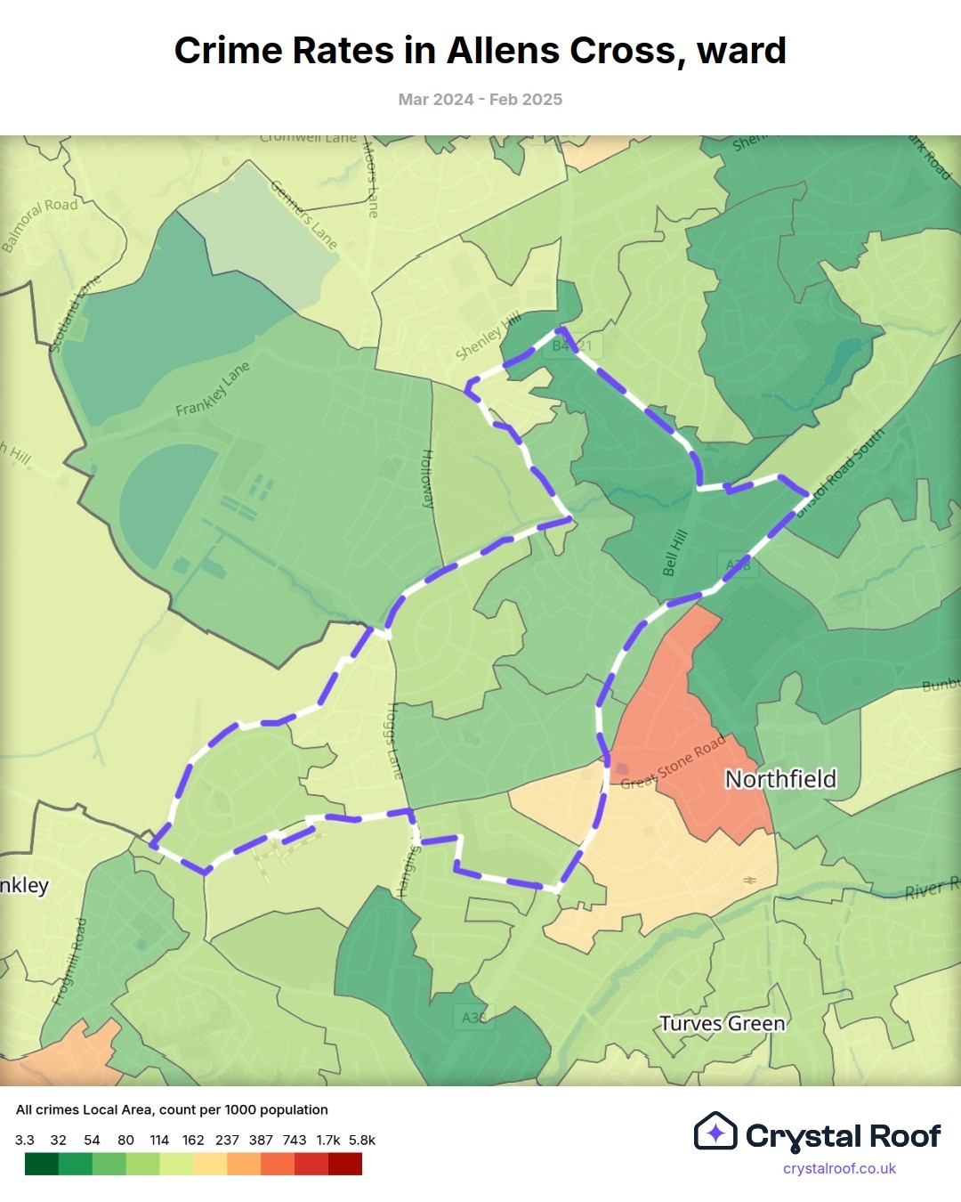 The figures in grey indicate the relative ratings of Allens Cross (ward) for a specific crime type compared to other wards in England and Wales.