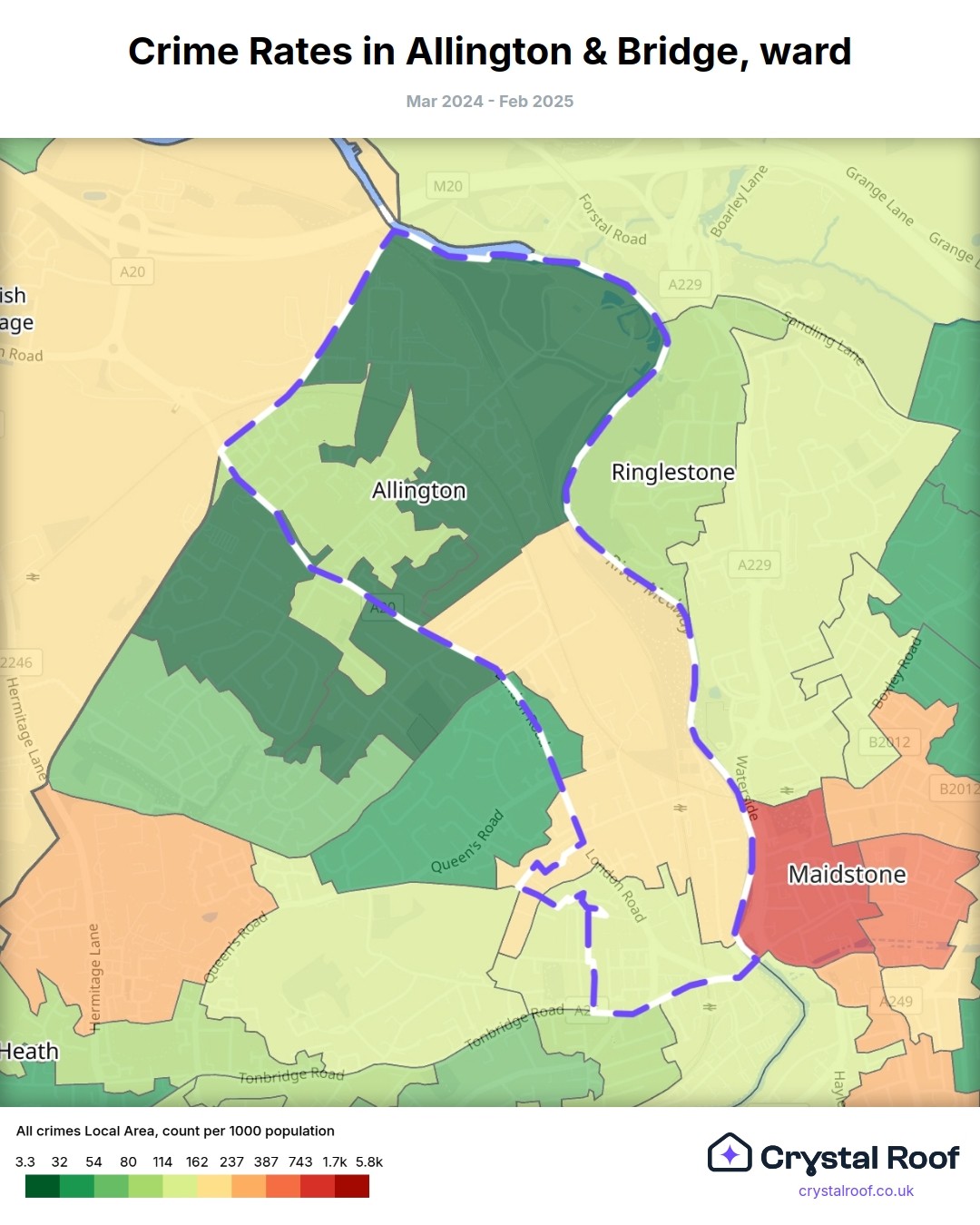 Allington & Bridge, (ward) includes areas with the following crime ratings (see map):