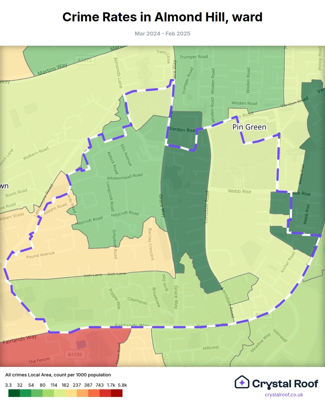 Almond Hill, (ward) includes areas with the following crime ratings (see map):