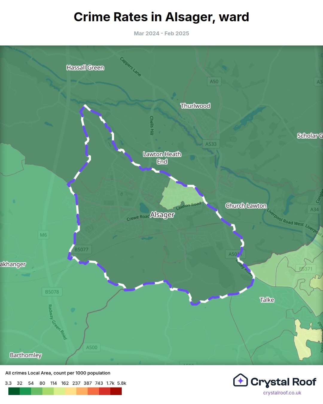 Alsager, (ward) includes areas with the following crime ratings (see map):