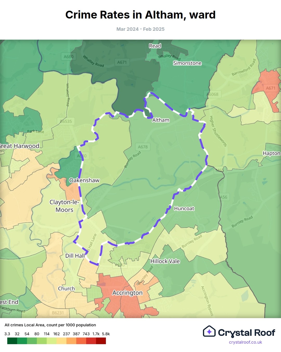 Altham, (ward) includes areas with the following crime ratings (see map):
