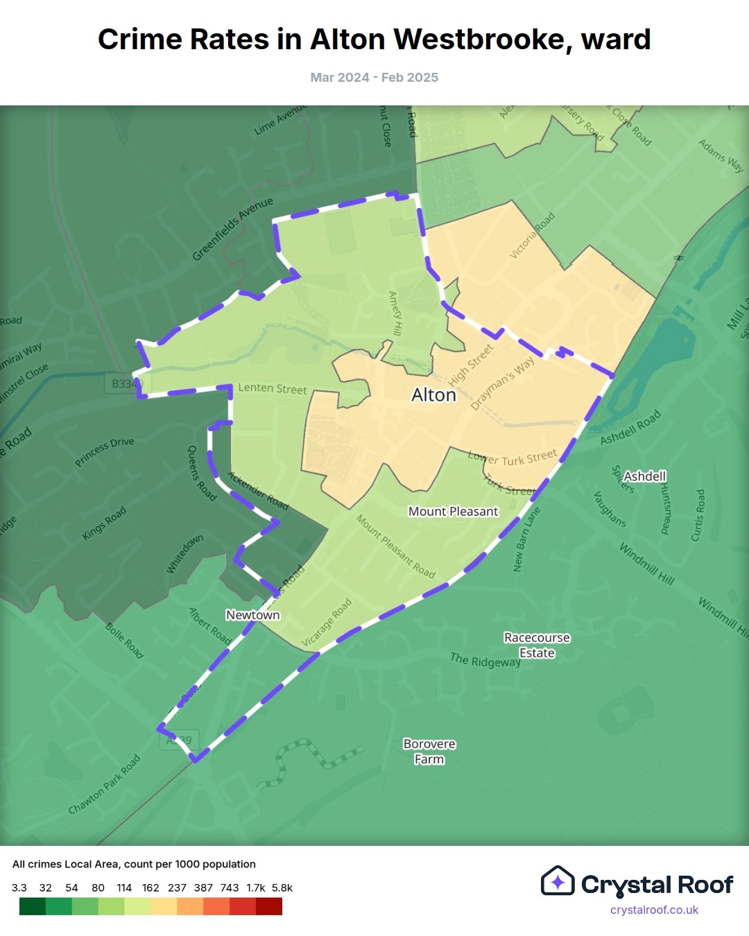 The figures in grey indicate the relative ratings of Alton Westbrooke (ward) for a specific crime type compared to other wards in England and Wales.